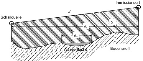 | dW | Abschnitt der horizontalen Entfernung zwischen Schallquellenmitte und Immissionsort über Wasserflächen, in m. |
