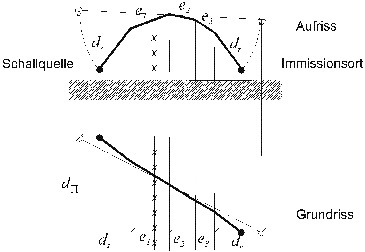 | d П | Abstand zwischen Punktschallquelle und Immissionsort, gemessen parallel zur Beugungskante (siehe Bild 5), in m, |