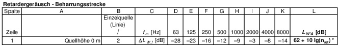 | LWA,f,h,kS | A-bewerteter Schallleistungspegel der Punktschallquelle in der Mitte des Teilstücks kS, der die Emission aus dem Höhenbereich h angibt nach der Gleichung (Gl. 6), in dB, |