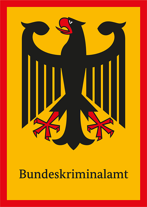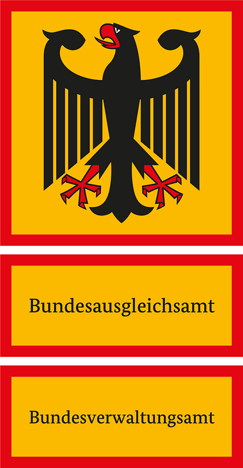 (1) Das Amtsschild der Bundesbehörden ist ein rotgerändertes, goldfarbenes Rechteck, in dem sich der schwarze Bundesadler befindet, den Kopf nach rechts gewendet, die Flügel offen, aber mit geschlossenem Gefieder, Schnabel, Zunge und Fänge von roter Farbe.