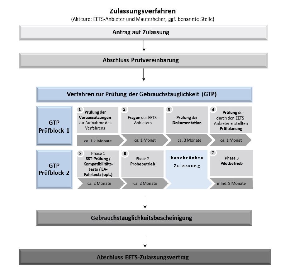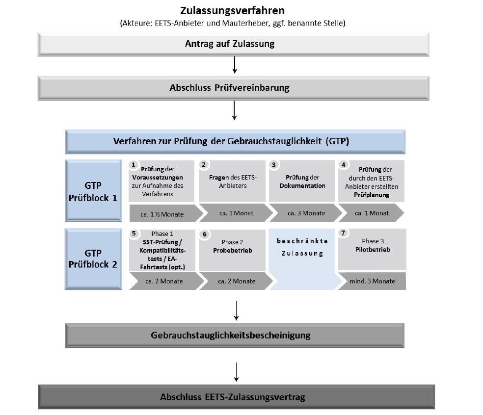 Der Ablauf des Prüfverfahrens für das EETS-Gebiet BFStrMG ist im BFStrMG und in der Verordnung über die Zulassung von Anbietern mautdienstbezogener Leistungen für das EETS-Gebiet Bundesfernstraßenmautgesetz (EEMD-ZV) festgelegt.
