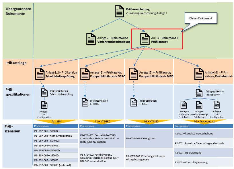 | P2.001.1 | Befahrung des mautpflichtigen Streckennetzes | Mehrtägige Befahrung des deutschen mautpflichtigen Streckennetzes | Nachweis der Übermittlung korrekter Fahrspurdaten und Verarbeitung zu Mautbuchungsnachweisen |