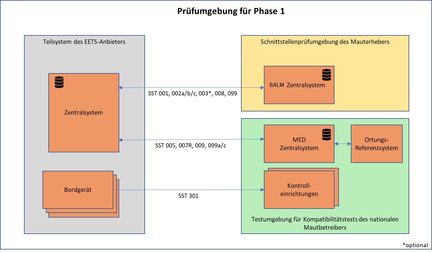 | P2.003.4 | Bereitstellung Informationen zu technischem Zustand EETS-Bordgerät über die SST 016 | Der Mauterheber stellt über die organisatorische Schnittstelle 016 eine Anfrage zum technischen Zustand eines Bordgeräts an den EA, welche vom EA beantwortet wird. | Nachweis der spezifikationskonformen Bereitstellung von Informationen zum technischen Zustand eines Bordgeräts über die SST 016 durch den EA |