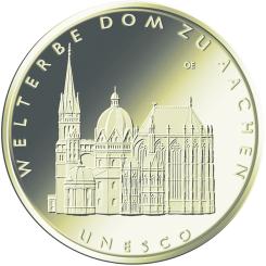 7Die Bildseite zeigt den Dom zu Aachen in seiner ganzen Breite und Höhe bis an den Münzrand gesetzt.