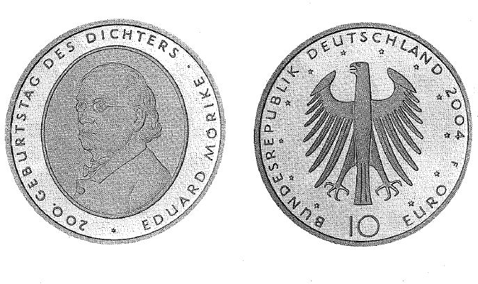 1Gemäß den §§ 2, 4 und 5 des Münzgesetzes vom 16. Dezember 1999 (BGBl. I S. 2402) hat die Bundesregierung beschlossen, anlässlich des 200. Geburtstages des Dichters Eduard Mörike eine deutsche Euro-Gedenkmünze im Nennwert von 10 Euro prägen zu lassen.