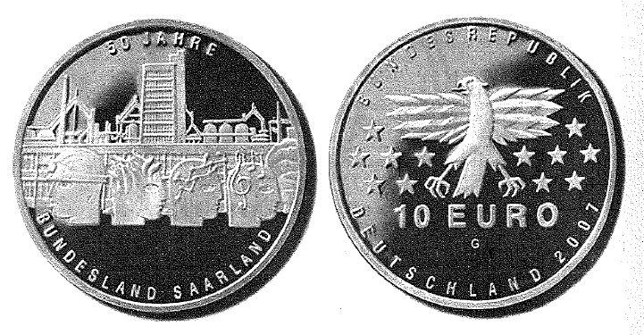 1Gemäß den §§ 2, 4 und 5 des Münzgesetzes vom 16. Dezember 1999 (BGBl. I S. 2402) hat die Bundesregierung beschlossen, zur Würdigung der 50-jährigen Zugehörigkeit des Saarlandes zur Bundesrepublik Deutschland eine deutsche Euro-Gedenkmünze im Nennwert von 10 Euro prägen zu lassen.
