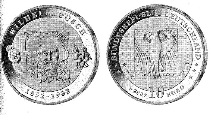 1Gemäß den §§ 2, 4 und 5 des Münzgesetzes vom 16. Dezember 1999 (BGBl. I S. 2402) hat die Bundesregierung beschlossen, aus Anlass des 175. Geburtstages von Wilhelm Busch eine deutsche Euro-Gedenkmünze im Nennwert von 10 Euro prägen zu lassen.