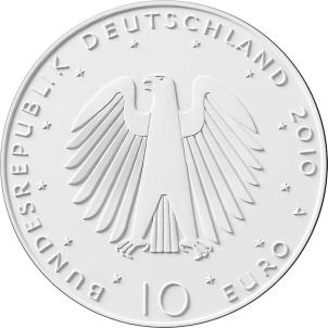 9Die Wertseite zeigt einen Adler, den Schriftzug „BUNDESREPUBLIK DEUTSCHLAND“, die Wertziffer und Wertbezeichnung, die Jahreszahl 2010 sowie das Prägezeichen „A“ der Staatlichen Münze Berlin.