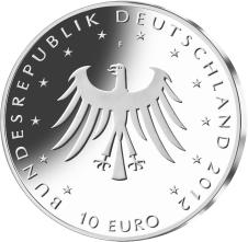 11Die Wertseite der Münze zeigt einen Adler, die Umschrift „BUNDESREPUBLIK DEUTSCHLAND 2012“ mit den zwölf Europasternen und der Wertbezeichnung „10 Euro“ sowie dem Münzzeichen „F“ der Staatlichen Münzen Baden-Württemberg in Stuttgart.