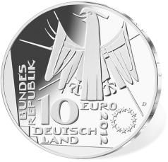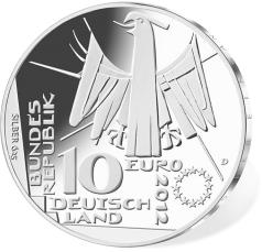 7Die 10-Euro-Gedenkmünze in der Stempelglanzqualität besteht aus einer Kupfer-Nickel-Legierung (CuNi25), hat einen Durchmesser von 32,5 Millimetern und eine Masse von 14 Gramm.