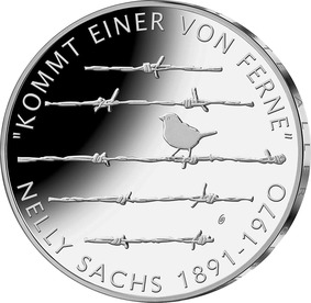 10Das Gedicht „Kommt einer von Ferne“, auf das die Münze Bezug nimmt, setzt sich mit der Aufarbeitung der Shoa, mit Flucht und Verfolgung auseinander und beweist damit zugleich eine hohe Aktualität.