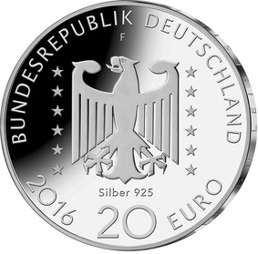 11Die Wertseite zeigt einen Adler, den Schriftzug „BUNDESREPUBLIK DEUTSCHLAND“, Wertziffer und Wertbezeichnung, das Prägezeichen „F“ der Staatlichen Münzen Baden-Württemberg, Prägestätte Stuttgart, die Jahreszahl 2016, die zwölf Europasterne sowie die Angabe „SILBER 925“.