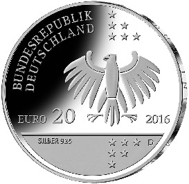 10Die Wertseite zeigt einen Adler, den Schriftzug „BUNDESREPUBLIK DEUTSCHLAND“, Wertziffer und Wertbezeichnung, das Prägezeichen „D“ des Bayerischen Hauptmünzamtes, München, die Jahreszahl 2016, die zwölf Europasterne sowie die Angabe