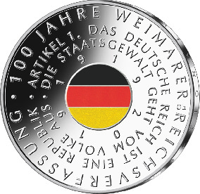2Die Münze würdigt das 100. Jubiläum des Inkrafttretens der ersten demokratischen Verfassung Deutschlands.