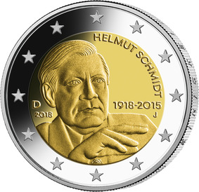 6Auf dem inneren Kern befinden sich ferner der Schriftzug „HELMUT SCHMIDT“, die Angabe „1918 – 2015“, das Ausgabejahr 2018, die Kennzeichnung „D“ für das Ausgabeland Bundesrepublik Deutschland, das Münzzeichen der jeweiligen Prägestätte („A“, „D“, „F“, „G“ oder „J“) sowie die Initialen des Künstlers.