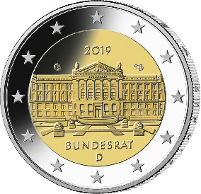 5Auf dem inneren Kern befinden sich ferner der Schriftzug „BUNDESRAT“, das Ausgabejahr 2019, die Kennzeichnung „D“ für das Ausgabeland Bundesrepublik Deutschland, das Münzzeichen der jeweiligen Prägestätte („A“, „D“, „F“, „G“ oder „J“) sowie die Initialen des Künstlers.