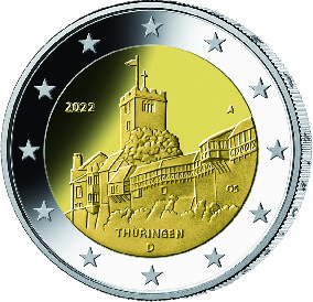 7Auf dem inneren Kern befinden sich ferner das Ausgabejahr 2022, die Kennzeichnung „D“ für das Ausgabeland Bundesrepublik Deutschland, das Münzzeichen der jeweiligen Prägestätte („A“, „D“, „F“, „G“ oder „J“) sowie die Initialen des Künstlers.