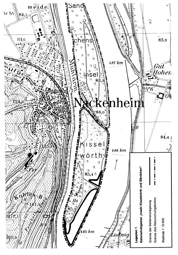 die Wasserflächen innerhalb der Parallelwerke an der Südspitze der Insel Kisselwörth von Rhein-km 484,82 bis Rhein-km 485,50 (Lageplan 1);