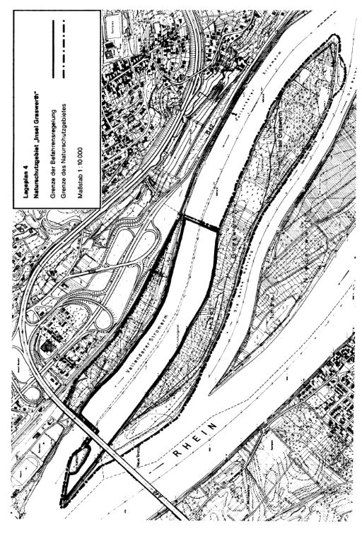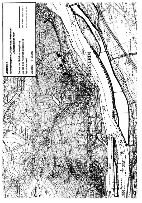 die Wasserflächen zwischen den Parallelwerken und der Insel Rüdesheimer Aue von Rhein-km 525,00 bis Rhein-km 526,85 und der Linie, die in einem Abstand von 60 m zum oberstromigen Parallelwerksende bei Rhein-km 525,00 beginnend zur nördlichen Seite der Insel Rüdesheimer Aue bei Rhein-km 525,65 führt und in einem Abstand von 190 m zum unterstromigen Parallelwerksende bei Rhein-km 526,85 endet (Lageplan 3);