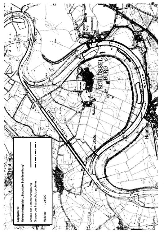 (5) 1Es ist untersagt, die Bundeswasserstraße Weser im Naturschutzgebiet „Staustufe Schlüsselburg“ zwischen Weser-km 232,06 und dem Wehr bei Weser-km 236,60 zu befahren (Lageplan 10). 2Satz 1 gilt nicht in der Zeit vom 16. April bis zum 30. September für Segelfahrzeuge mit Antriebsmaschine und sonstige Kleinfahrzeuge ohne Antriebsmaschine. 3In der Zeit vom 1. Oktober bis zum 15. April dürfen Kleinfahrzeuge ohne Antriebsmaschine nach Einstellung des Betriebes der Schleuse Schlüsselburg bis ½ Stunde nach Sonnenuntergang die in Satz 1 bezeichnete Wasserfläche zügig durchfahren. 4Wasserfahrzeuge, die die in Satz 1 genannte Wasserfläche befahren dürfen, müssen, außer im Bereich der Bootsumtragestelle und der genehmigten Steganlagen, einen Mindestabstand von 15 m zu den Ufern einhalten.