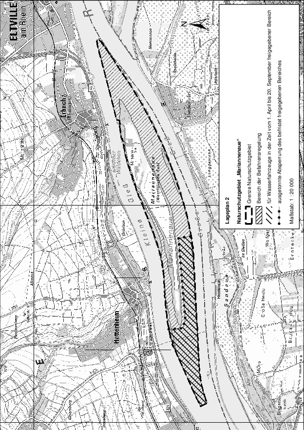die Wasserflächen innerhalb der die Insel Mariannenaue umgebenden Parallelwerke von Rhein-km 512,04 bis Rhein-km 517,35. Ausgenommen hiervon bleibt das Befahren in der Zeit vom 1. April bis zum 20. September im westlichen Abschnitt, der durch die südliche Grenze der Befahrensregelung und eine ausgetonnte Linie begrenzt wird, die von Rhein-km 515,0 bis zur westlichen Spitze der Insel Mariannenaue in einem Abstand von jeweils 40 m zum Ufer und von dort in gerader Linie bis zum nördlichen Parallelwerk verläuft (Lageplan 2).