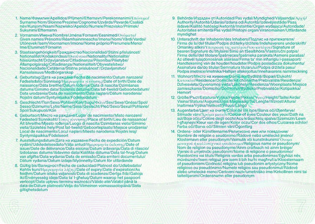 | Feld Nr. | Feldbezeichnung | Schriftgröße 1 Schriftfont des Passherstellers Schriftgröße 2,0 mm |