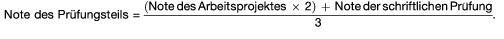 (2) Für die Bewertung des Prüfungsteils „Pferdehaltung, Pferdeeinsatz, Pferdezucht und Dienstleistungen“ ist eine Note aus der Bewertung des Arbeitsprojektes (§ 7) und der Bewertung der schriftlichen Prüfung (§ 8) nach folgender Formel zu bilden: