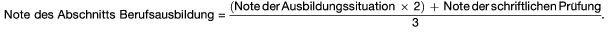 (4) 1Im Prüfungsteil „Berufsausbildung und Mitarbeiterführung“ ist zunächst eine Note für die Bewertung des Abschnitts „Berufsausbildung“ aus der Bewertung der Ausbildungssituation (§ 15) und der Bewertung der schriftlichen Prüfung (§ 16) nach folgender Formel zu bilden: