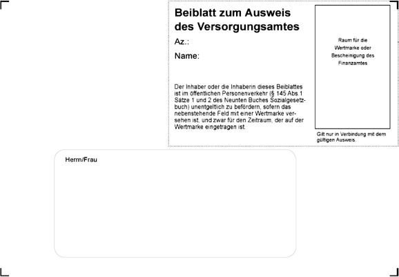 (1) 1Zum Ausweis für schwerbehinderte Menschen, die das Recht auf unentgeltliche Beförderung im öffentlichen Personenverkehr in Anspruch nehmen können, ist auf Antrag ein Beiblatt nach dem in der Anlage zu dieser Verordnung abgedruckten Muster 2 in der Grundfarbe weiß auszustellen.