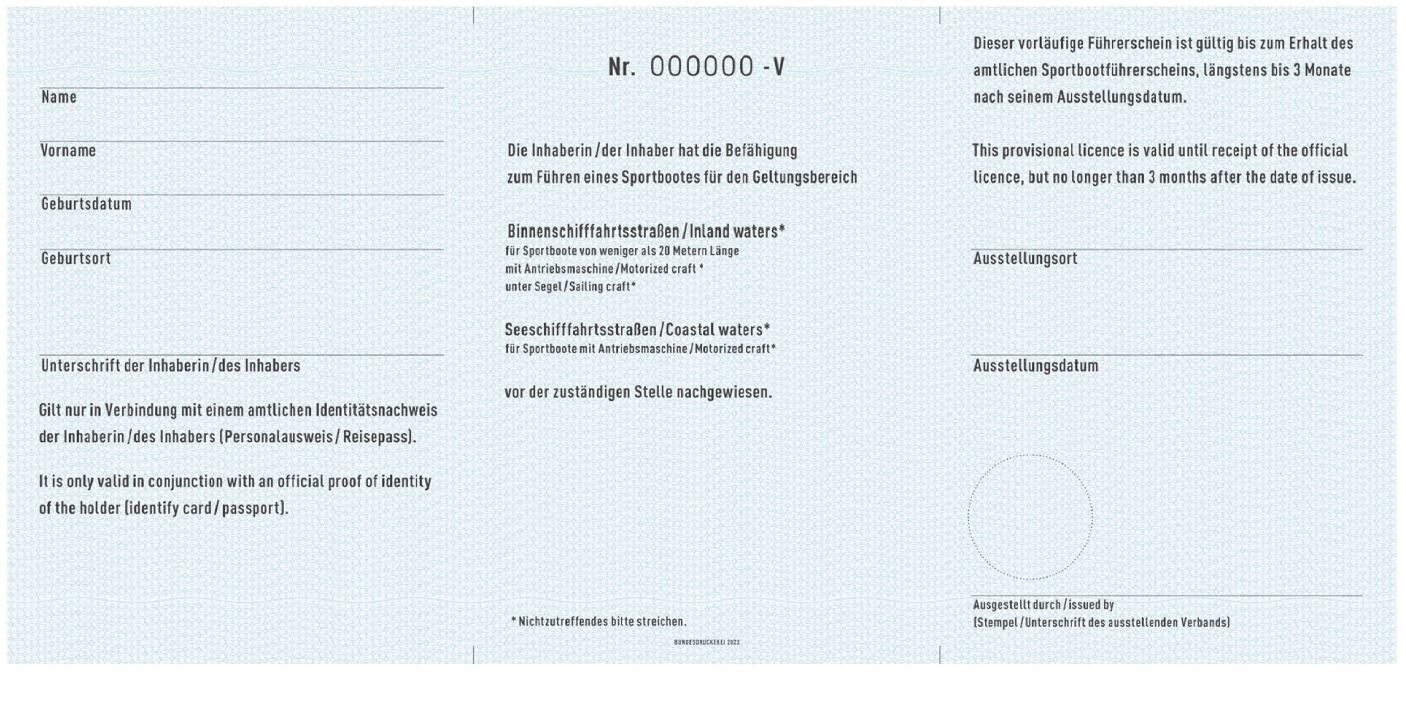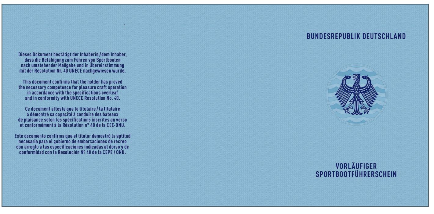 2Sofern erforderlich, wird auf Antrag des Bewerbers ein vorläufiger Sportbootführerschein nach dem Muster der Anlage 9 ausgestellt.