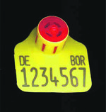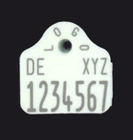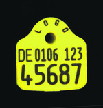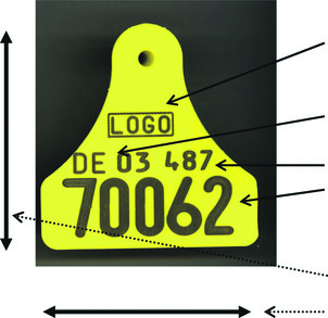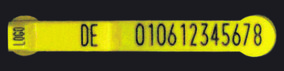 | Ländercode „DE“ (Deutschland) und 12-stellige Nummer (zweizeilig): – „01“ (Tierartenkenncode) – 2 Ziffern (Bundesland) – 8 Ziffern (individuell) |