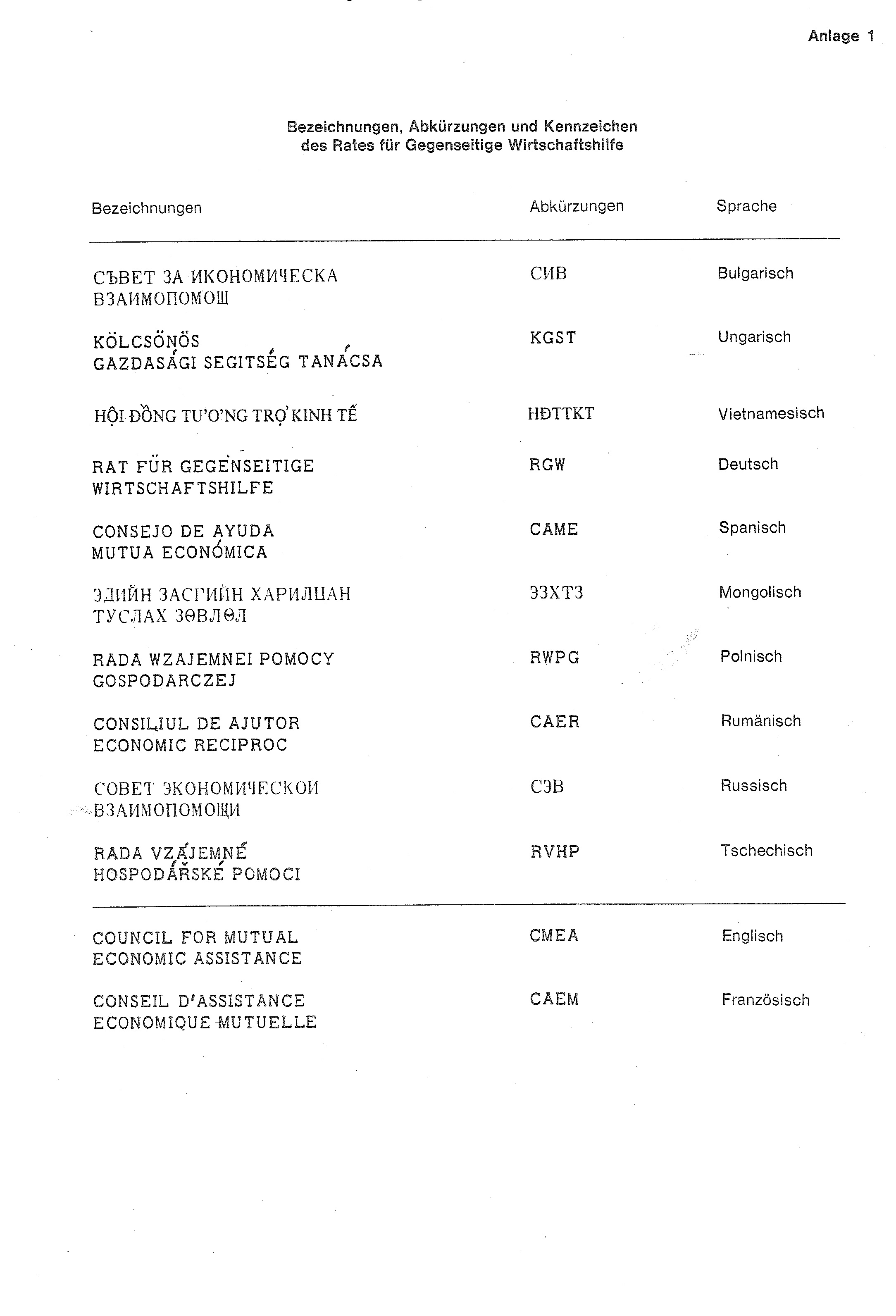 (1) Auf Grund des § 4 Abs. 2 Nr. 3a des Warenzeichengesetzes in der Fassung der Bekanntmachung vom 2. Januar 1968 (BGBl. I S. 1, 29) wird bekanntgemacht, daß die Bezeichnungen, Abkürzungen und Kennzeichen des Rates für Gegenseitige Wirtschaftshilfe (Anlagen 1 und 2) von der Eintragung als Warenzeichen ausgeschlossen sind.