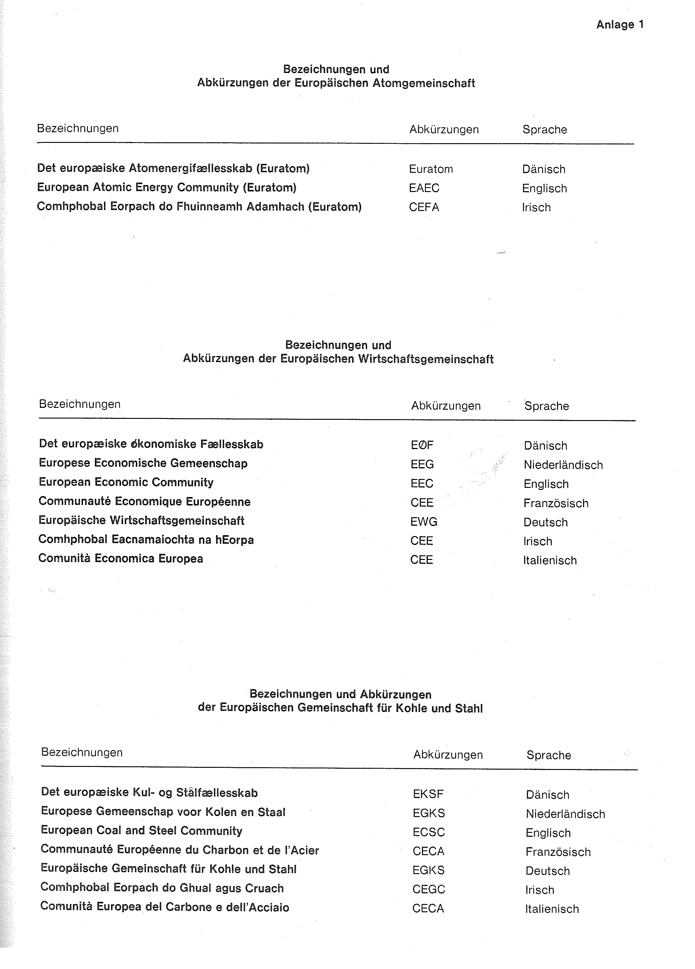 (1) Auf Grund des § 4 Abs. 2 Nr. 3a des Warenzeichengesetzes in der Fassung der Bekanntmachung vom 2. Januar 1968 (BGBl. I S. 1, 29) wird bekanntgemacht, daß die Bezeichnungen und Abkürzungen der Europäischen Gemeinschaften (Anlage 1) und das von der Kommission der Europäischen Gemeinschaften verwandte Kennzeichen (Anlage 2) von der Eintragung als Warenzeichen ausgeschlossen sind.