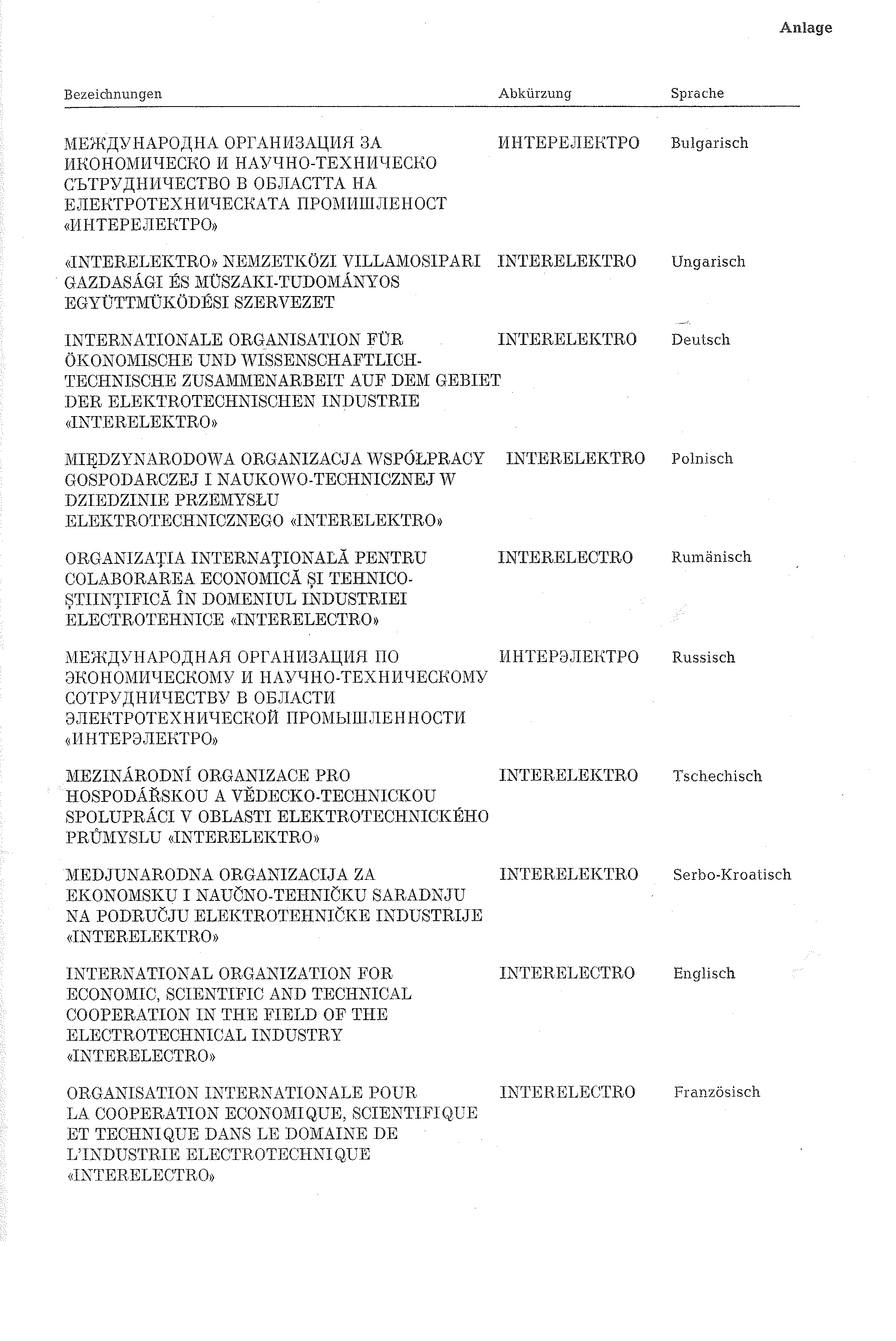 (1) Auf Grund des § 4 Abs. 2 Nr. 3a des Warenzeichengesetzes in der Fassung der Bekanntmachung vom 2. Januar 1968 (BGBl. I S. 1, 29) wird bekanntgemacht, daß die Bezeichnungen, die Abkürzungen und das Kennzeichen der Internationalen Organisation für Ökonomische und Wissenschaftlich-Technische Zusammenarbeit auf dem Gebiet der Elektrotechnischen Industrie "INTERELEKTRO" (Anlage) von der Eintragung als Warenzeichen ausgeschlossen sind.